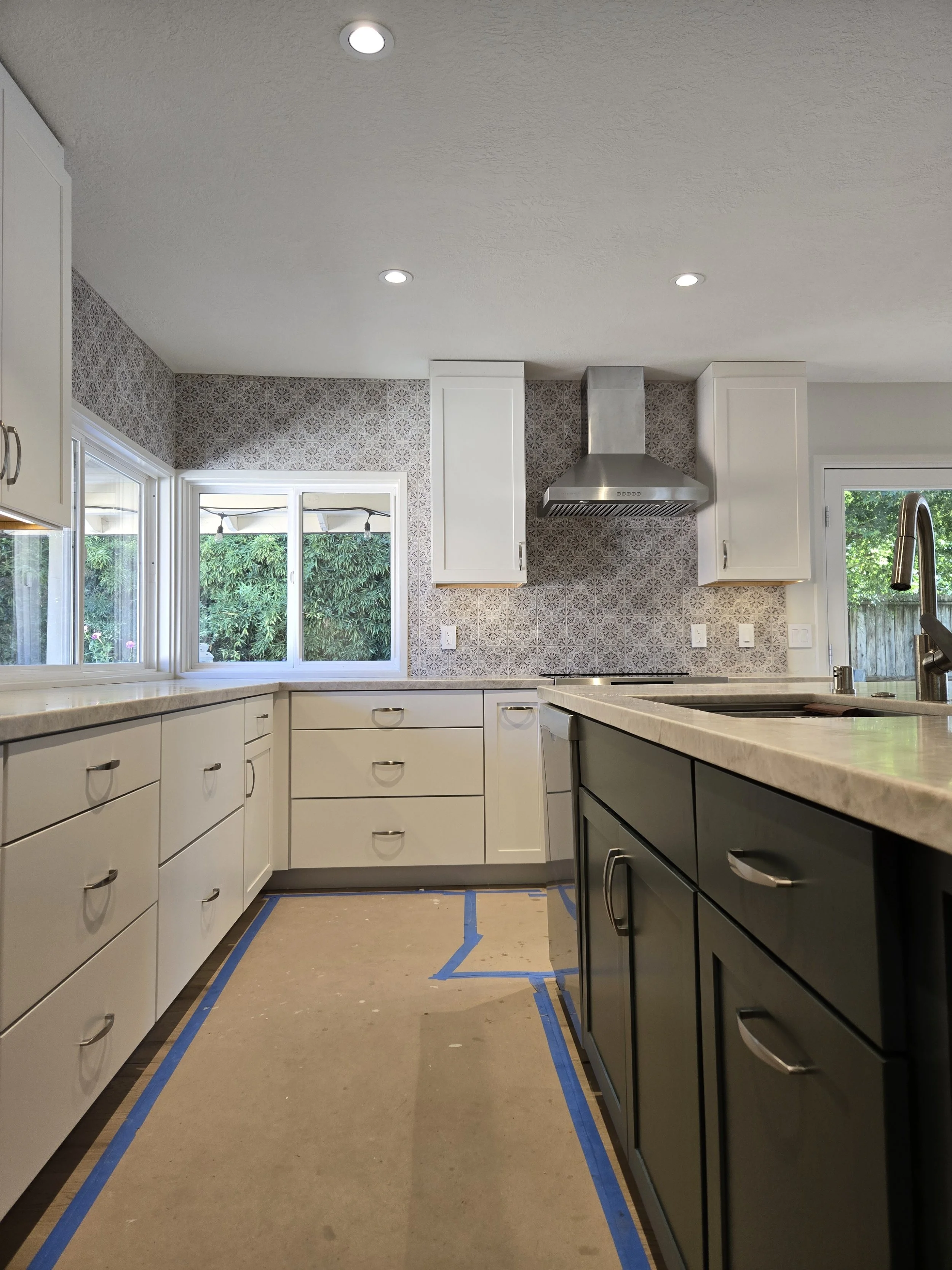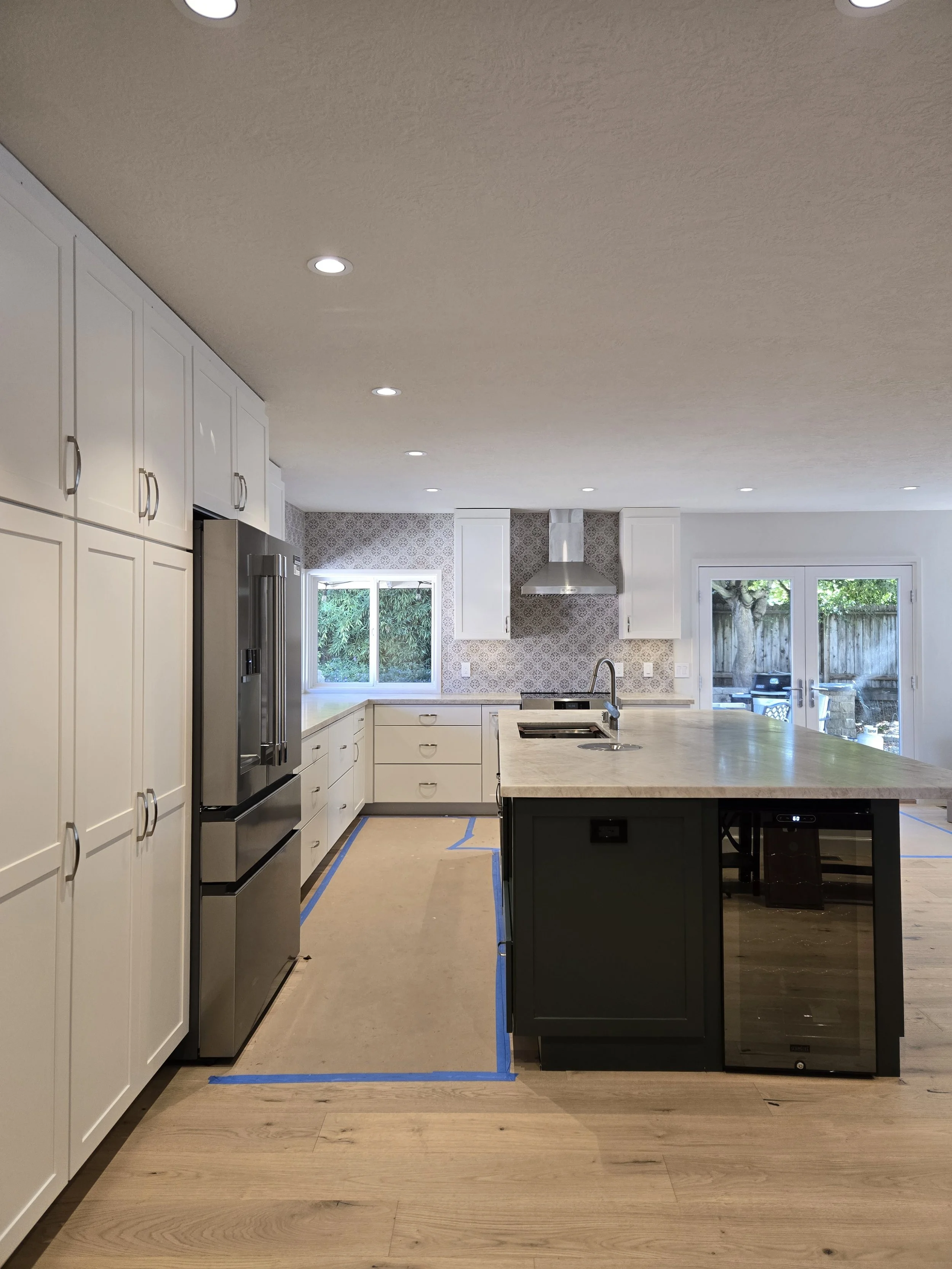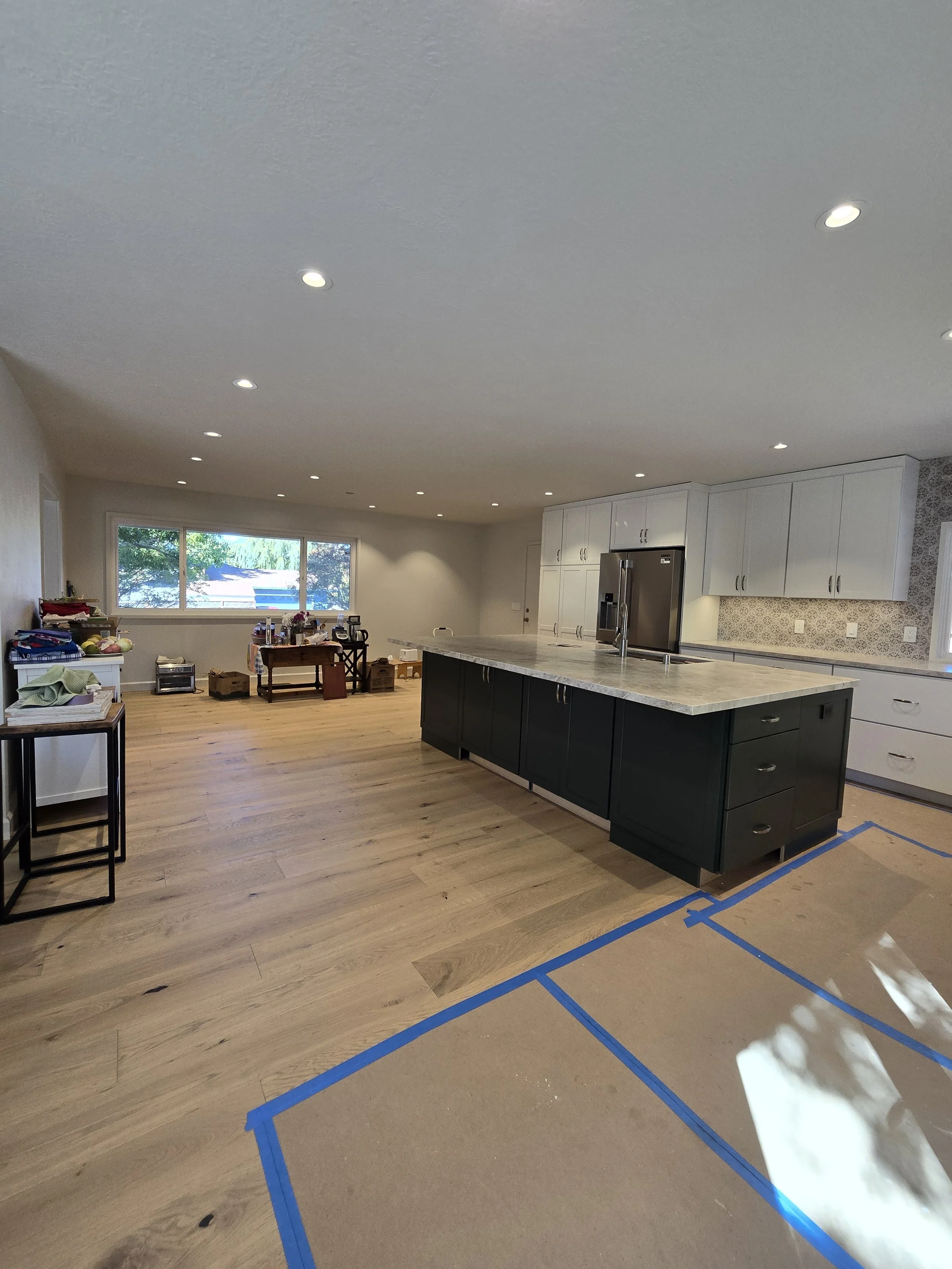 After the removal of the two walls (one separating the kitchen and dining area and one separating the dining area and the family room), we were left with one enormous space that was open to the primary living room space.