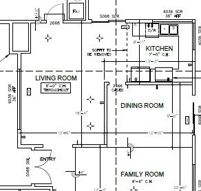 In the image below you can see the original floor plan. The plan was to remove two walls: the one between the kitchen and dining room and the one between the dining room and what is labeled as the living room. But, truly, the way she used the space was that the living room and family rooms were swapped—what is labeled as living room was actually a bit of inefficiently used family room space. She mostly used her living room (which is labeled as family room here) as her primary living space.